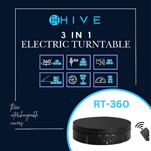 The HIVE 3-in-1 Remote Control Electric Turntable Smart Rotating Display Stand is a sophisticated and multifunctional accessory ideal for showcasing products, capturing 360° photography, and enhancing visual presentations. With its smooth rotation, multiple speed settings, and remote control functionality, it’s perfect for professional use or personal projects. The Rotating Display Stand is a versatile and convenient device designed to showcase your products or collectibles with style and precision.