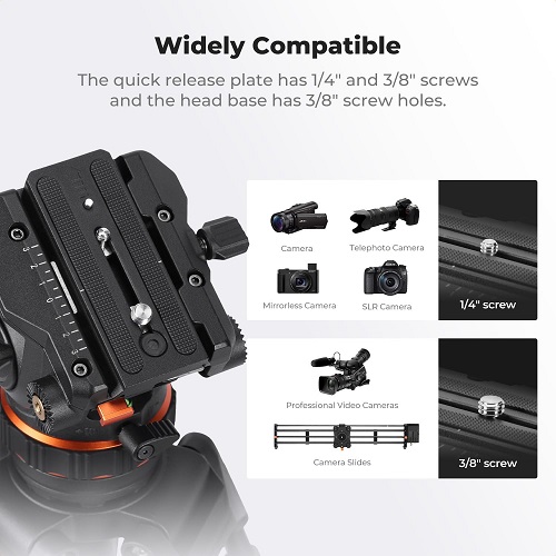 - Quick-release plate with 1/4″ & 3/8″ screws – compatible with DSLR, mirrorless & video cameras