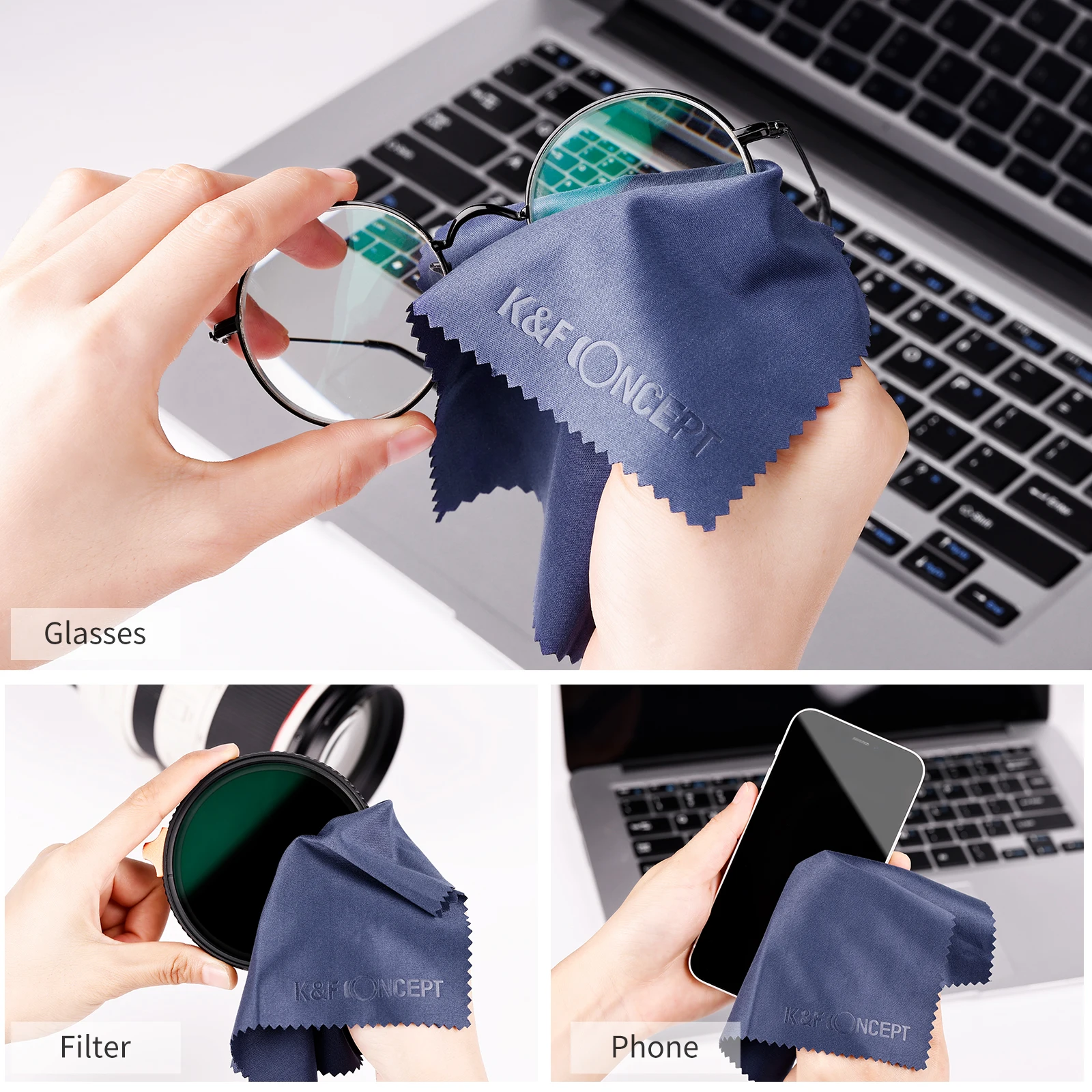 The Microfiber Cleaning Cloth fits cleaning camera lens, smart phone, tablet, kindle, eyeglass, watch, jewelry and other delicate surfaces. Extremely soft microfiber cleaning cloth can effectively absorb and remove dust, fingerprints and oil smudges without leaving debris. Besides that, the cloth can be used repeatedly after being washed.