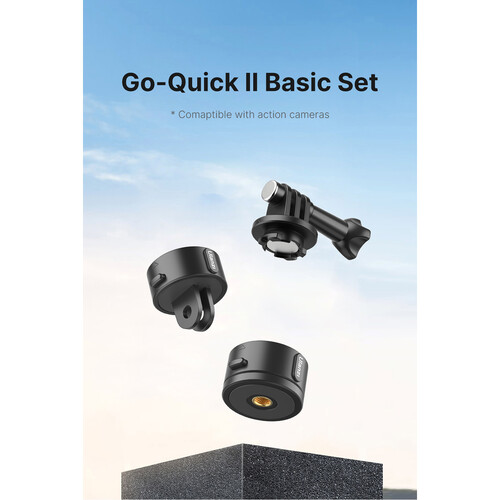 Ulanzi Go-Quick II Basic Magnetic Mount Set and its various components to your action camera tripods or mounts for quick release compatibility. Included in the set is a 3-prong camera mount compatible with various action camera models from DJI, Insta360, and GoPro which then inserts into either of the two bases. One of the bases is equipped with a 1/4″-20 thread while the other two have 2-prong mounts for compatibility with various tripods or selfie sticks. Both a magnetic connection and a quick release button keep your camera secure inside your base of choice.