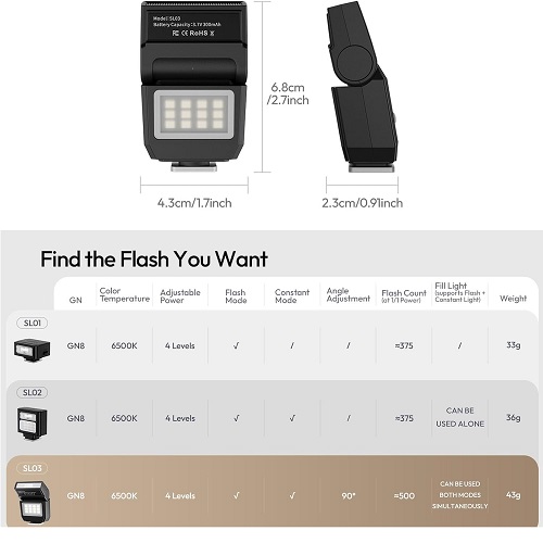 The flash supports four adjustable power levels (1/1, 1/2, 1/4, and 1/8), allowing photographers to control the intensity of light depending on the scene and subject distance. One of the standout features of this flash is its 90° adjustable head, which allows users to switch between direct flash and bounce flash for softer, more natural lighting. This flexibility helps reduce harsh shadows and produces more professional-looking photos. The SL03 also includes three lighting modes—Flash, Constant Light, and Flash + Fill Light, giving creators more versatility for both photography and video shooting. The built-in constant light can also act as a focus assist lamp, helping cameras focus quickly in low-light environments.